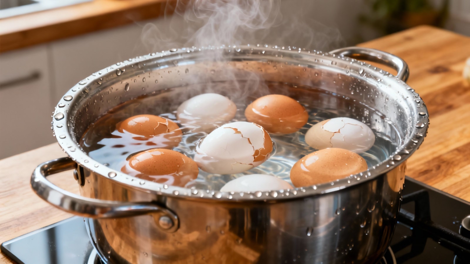 Placez votre casserole sur feu vif jusqu’à l’ébullition franche. Dès les premiers bouillons, réduisez immédiatement le feu pour maintenir une ébullition douce mais constante. Cette méthode évite que les œufs se cognent violemment et se fissurent.
